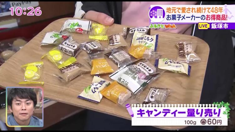 福岡県飯塚市の「筑豊製菓」はキャンディーやスナック菓子などを手掛ける総合菓子メーカー。工場に併設する直売所では、まんじゅう、カステラ、パウンドケーキ、せんべいなどのお菓子を割引価格で購入することができます。