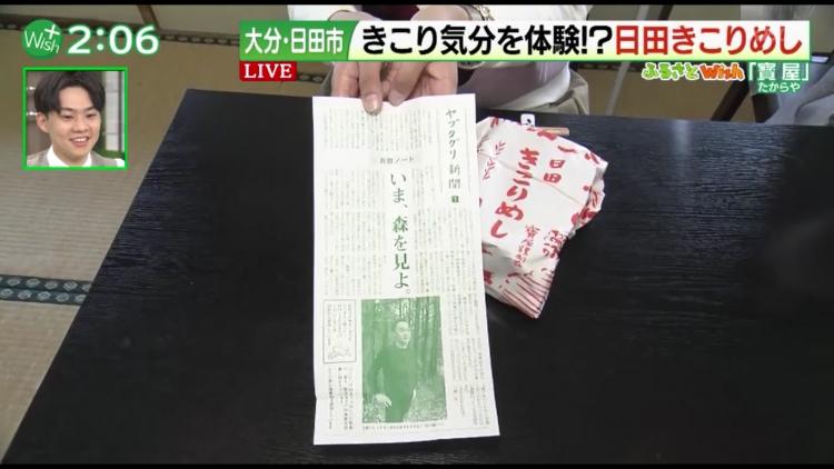 かわいい包み紙の中には、日田スギで作った曲げわっぱ風の弁当箱が。パカッとふたを開けると、麦飯の真ん中に、なんと丸太に見立てた太~いゴボウ!見た目だけでもインパクト大ですが、それだけではないんです。弁当に付いている日田スギののこぎりで、ゴボウを切って食べることができます!「日本初の体験型弁当です」と日田市観光協会事務局長で「ヤブクグリ」メンバーの黒木陽介さん。大人もテンションが上がっちゃいそうですね。ゴボウは「軟らかく煮ていて、だしがきいていますね。ご飯が進む味です」とアイタガールの原実記レポーター。