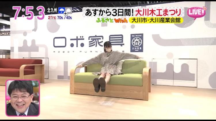会場内には、ダイニングテーブルセットやデザイン性が高いコートラック、サイドテーブル付きのサイクルラックなど、あらゆる家具とインテリアが展示されています。その数およそ1万点!また、自動で動くソファを体験できる「ロボ家具ライド」エリアも(要整理券)。実際に「ロボ家具」のソファに乗った松岡はなさん。左右に動いたり、グルっとまわるソファに最初驚いていましたが、とっても楽しそう!大川市役所インテリア課の国武正寛さんは「未来の家具の可能性を考えて挑戦しました!」と話します。将来普及されれば、簡単に模様替えができたり、子どもたちの乗り物になったりと、いろいろな楽しみ方ができそうですね。