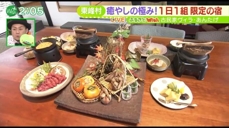 5日前までに予約すれば会席料理も楽しむことができます。料理人として20年のキャリアを持つ森山さん。この日、準備していただいた「里山会席」(一人前6600円)は “柿”の白和え、“ブドウ”とミョウガの酢の物など旬の果物を取り入れた品をはじめ、東峰村の棚田米のちまきなど、地元の食材をふんだんに使った料理が並びます。