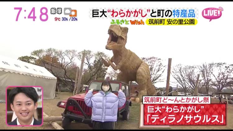 展示期間は2023年1月下旬まで。12月25日の夜間にはライトアップも予定しています。「生で見ると本当に迫力があってすごいですね!」とリポーターのボビー。細部にまでこだわった巨大わらかがし「ティラノサウルス」の迫力をぜひ直接体感してくださいね♪