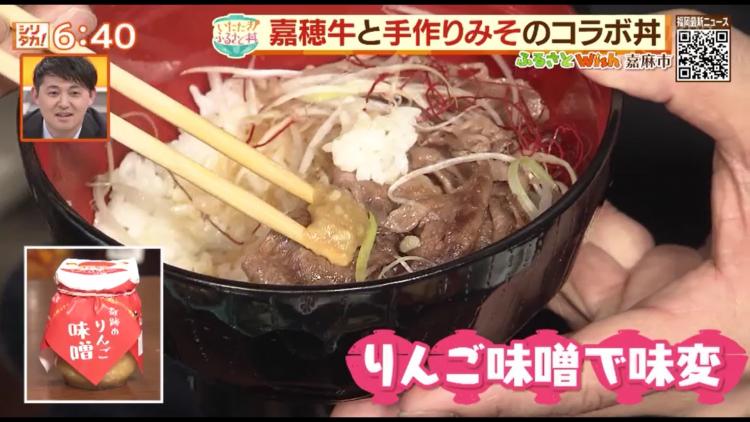 調理方法は超シンプル!器に盛った炊き立ての白米の上に、つけダレ用のみそを塗り、軽く火を通した嘉穂牛のローススライスをのせるだけ!嘉麻市のふるさと丼「嘉穂牛とLadybug熟成みそダレとのコラボ丼」が完成です♪久保さんは「嘉穂牛はブランド牛なので、そのまま肉の甘さを味わってほしくて、あえて味噌を下にひいています」とシンプルな調理にこだわった理由を話します。試食した石井リポーターも、そのおいしさにお箸が止まりません。さらに!そのまま食べても十分おいしい丼ですが「リンゴ味噌」「ネギ」「味噌ジュレ」の3つの“味変”用の小鉢も付いてくるんです。「りんご味噌」で“味変”を楽しんだ石井リポーターは「肉の甘味とはまた違った甘味で、すごくよく合いますね」と絶賛!