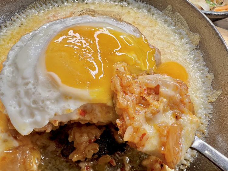 絵に描いたような目玉焼きを崩して、とろっとろのチーズと辛いポックンパに絡めて食べると、もうその幸せたるや言わずもがなです。