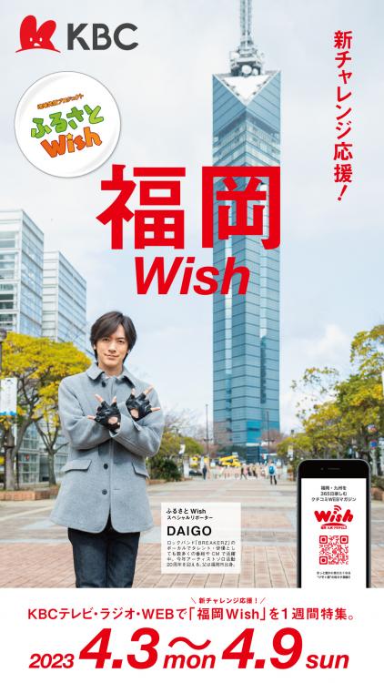 新年度一発目となる今週は『福岡Wish~新チャレンジ応援!~』がテーマ!なんとこの1週間は、ふるさとWishスペシャルリポーターとして「うぃっしゅ」でお馴染みの『DAIGO』さんがロケ取材に登場!!お見逃しなく!!!【DAIGOさんご出演予定】4/4(火)アサデス。KBC 6:00-8:00(ふるさとWish 7:50ごろ~)4/6(木)アサデス。KBC 6:00-8:00(放送時間未定)/シリタカ!18:15-19:00(放送時間未定)