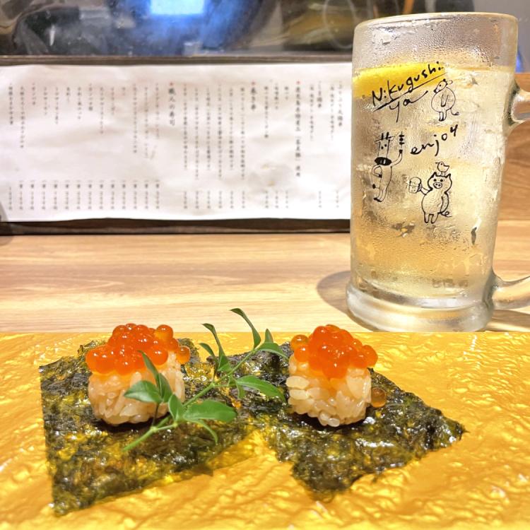 まず驚いたのが、お通しにいくらのお寿司が出てきます。