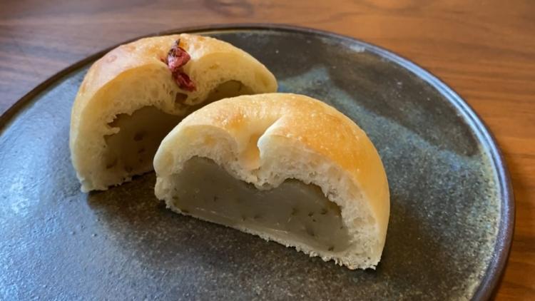 桜の葉の塩漬け×白あんを包んだ『さくらあんぱん』。