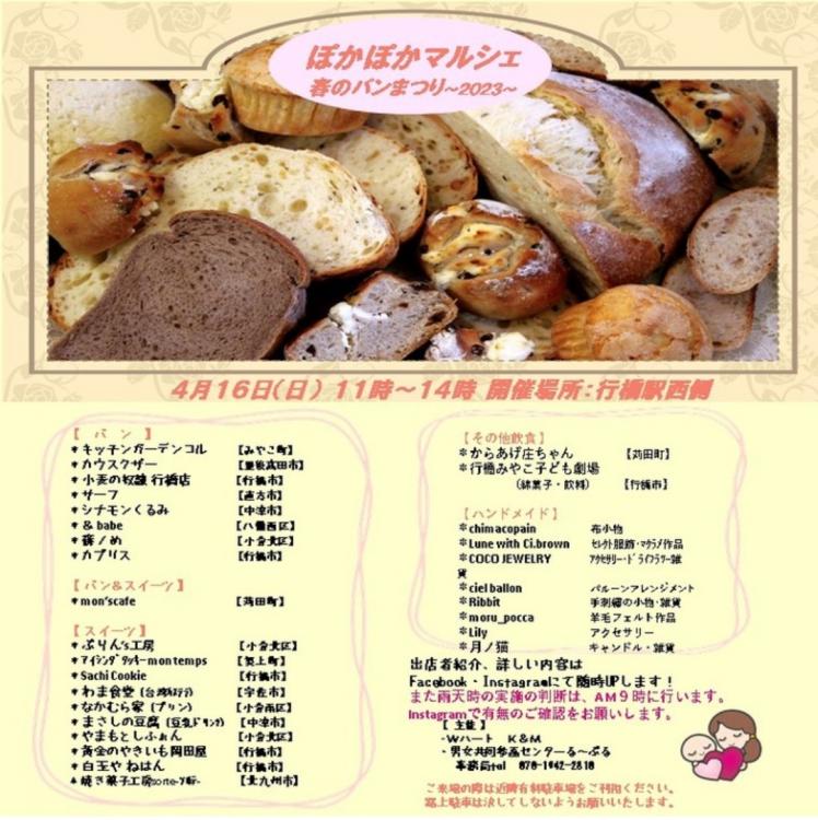 4月16日(日)に、JR行橋駅西側(福岡県行橋市)で「ぽかぽかマルシェ 春のパンまつり~2023~」が行われます。