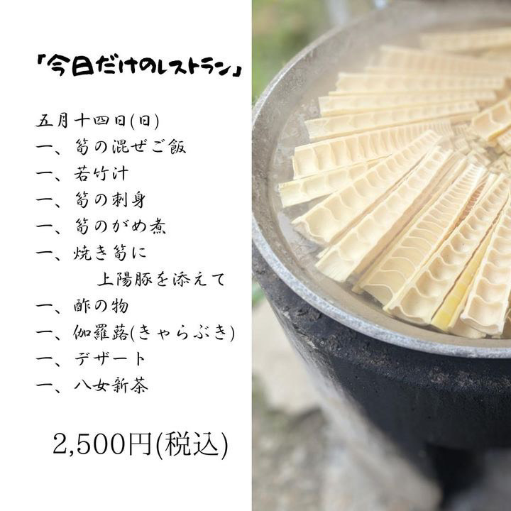 筍ご飯、わかたけ汁、筍の煮物、筍の刺身など、八女の筍料理を堪能できる1時間です。