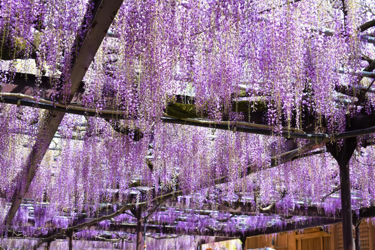 その下を歩くと、まるで紫の雨が降り注いでいるようです。