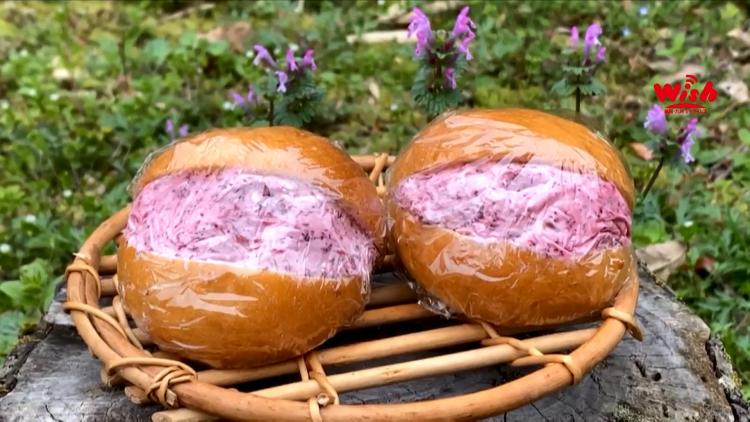 那珂川市特産のやまももジャムをクリームに練りこんで、パンにどっさりはさんでいます。