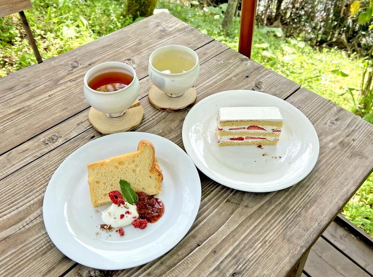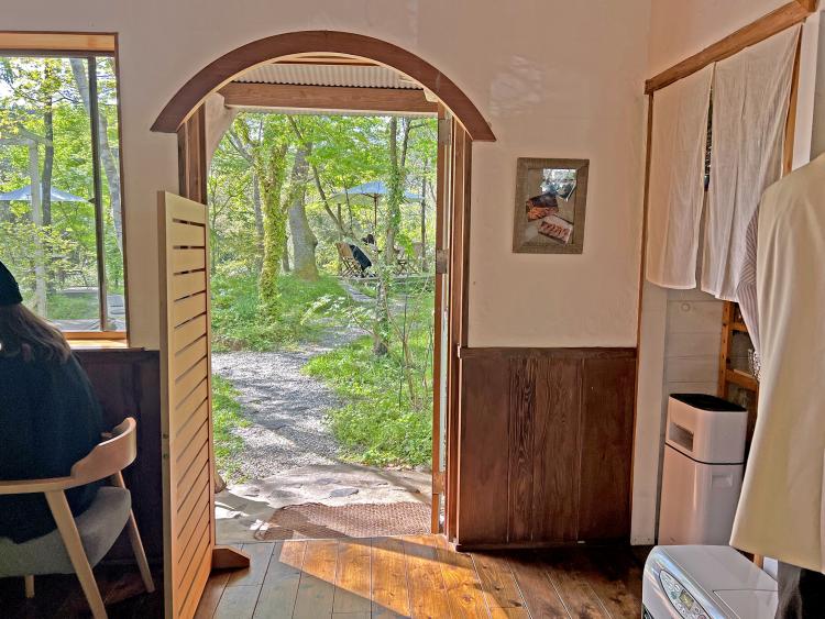テラス席に繋がるドアやスイーツが可愛すぎて