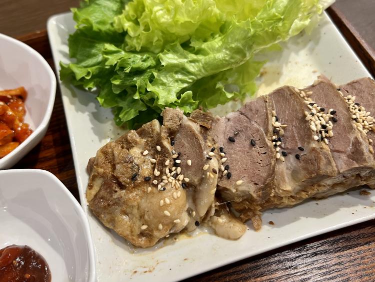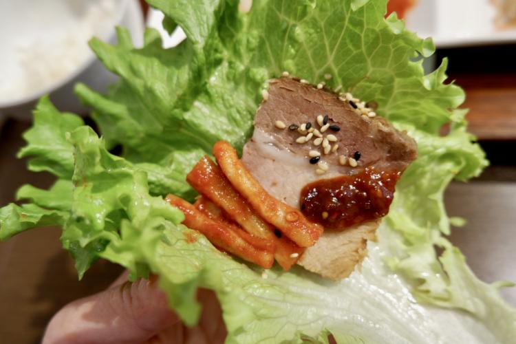 今回は、その中でもお一人様ではなかなか注文できない「ポッサム定食」(1380円)をオーダー。ポッサムとは茹で豚に味噌や香味をつけて野菜で包んで食べる韓国でも定番の豚肉料理。それが定食で食べられるのだから、韓国料理好きとしてはありがたい限りです。
