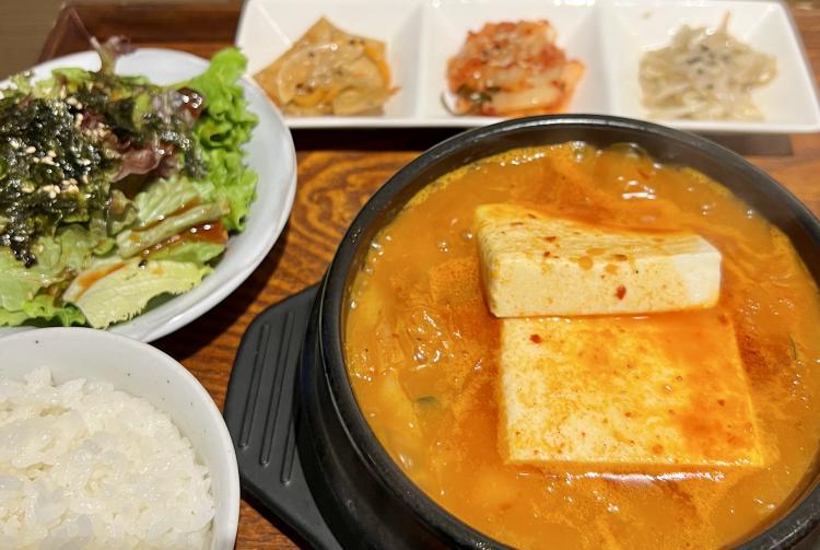 オーナーのハンジュさんは、本場韓国の家庭や市場の味を気軽に一人でも楽しめるようにと、昼夜通しで定食メニューを提供。その数、なんと19種類(”23年3月時点)!定食はメイン料理にご飯、おかず3種類、サラダにスープまで付いていて、1200〜1500円と良心的な価格&男性でも大満足のボリューム。