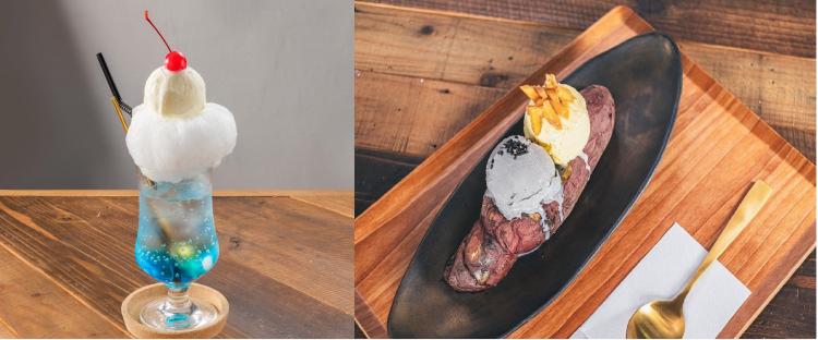 インパクト抜群の綿菓子を使った「青空クリームソーダ(600円)」やお芋丸ごと「アイスる芋(750円)」など思わず写真を撮りたくなるようなスイーツはSNSでも話題に!