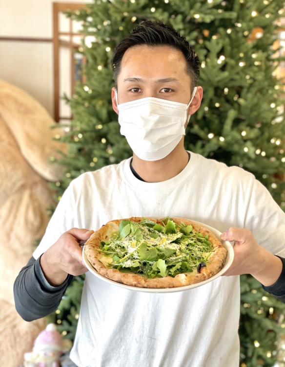 チーズベースのピッツァに、ルッコラをはじめとした上毛町産の旬野菜、そしてその上から、上毛町自慢の丸ごとおいしいレモンの「皮」がたっぷり!