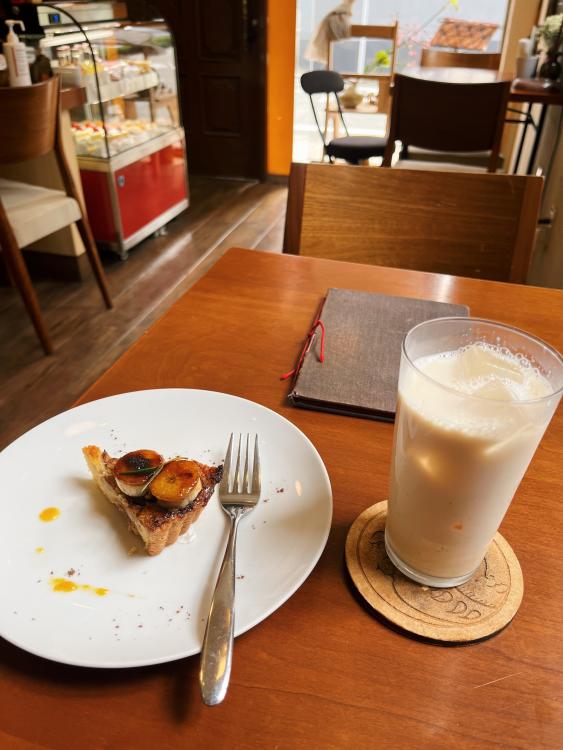 生地にココナッツがたっぷり入った食感が楽しいバナナタルトと、ミルクのまろやかな味わいのロイヤルミルクティー。
