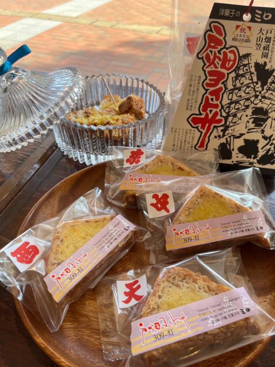 先代から続く、伝統菓子「戸畑ヨイトサ」(1つ250円、4個入り1300円)は、オレンジ風味のパウンド生地をアーモンドの入ったメレンゲで覆った焼き菓子。提灯山笠をイメージしたピラミッド型で、夏のお土産にオススメです。