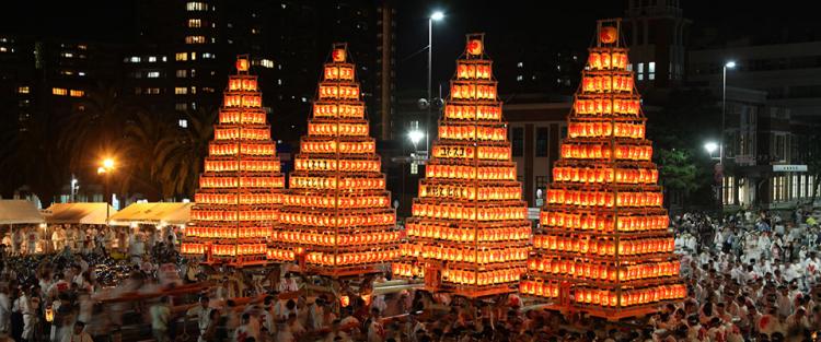 昼は紅白の幟(のぼり)を掲げた幟山笠(のぼりやまかさ)が、夜になると光のピラミッドのような提灯山笠(ちょうちんやまかさ)に大変身します。4基の大山笠と中学生が担ぐ小若山笠4基、全8基が勢ぞろい!12段309個の提灯が織りなす光景は幻想的です。担ぎ手たちの「ヨイトサ!」の掛け声とともに競演する勇壮な姿は見逃せません!