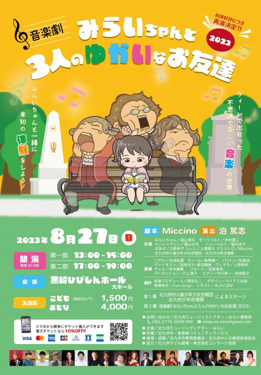 8月27日(日)に黒崎ひびしんホール(北九州市)で、音楽劇『みらいちゃんと3人のゆかいなお友達』が上演されます。