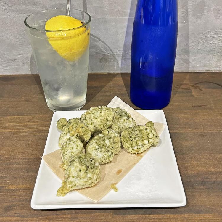甘くないドーナツで、適度な青のりと塩の味付けにお酒がすすむ。
