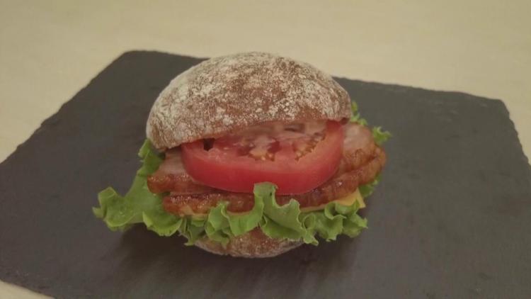 マッシュポテト入りのもちもち生地にベーコンやレタス、トマトなどをサンド。