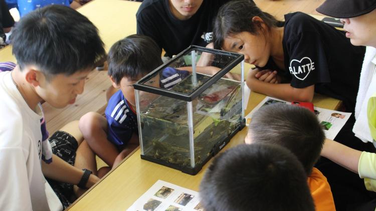捕まえた生き物たちは、九州産業大学の学生たちと一緒に顕微鏡で詳しく観察しよう。