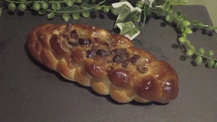 6つに編んだブリオッシュ生地に、クリームと栗の渋皮煮を乗せたドイツのお菓子。