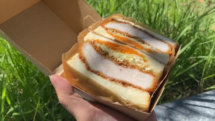 九州産の銘柄豚を使った『九州銘柄豚ロースカツサンド』(993円、ハーフ497円)の分厚さときたら!