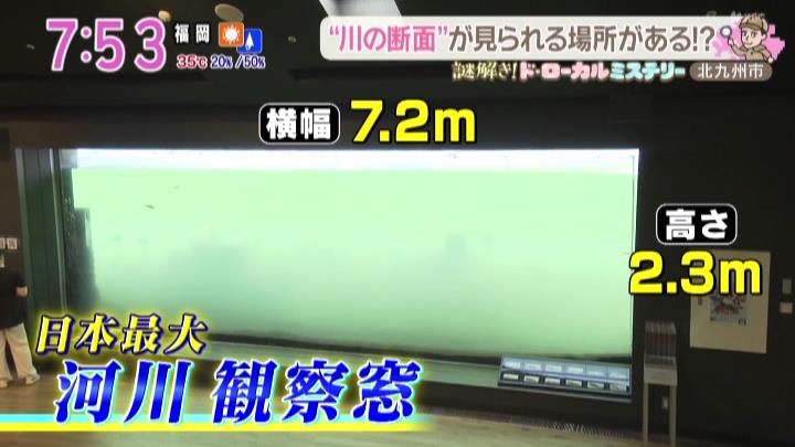 北九州市最大の二級河川である紫川に隣接する施設「北九州市立 水環境館」。地下に続く階段を下りていき奥へ進むと、大きなガラスの窓を発見!なんとその高さ2.3メートル、横幅は7.2メートルで、河川を観察する“河川観察窓”としては日本最大。まさに川の断面を見ることができる謎というのはこのことだったのです♪