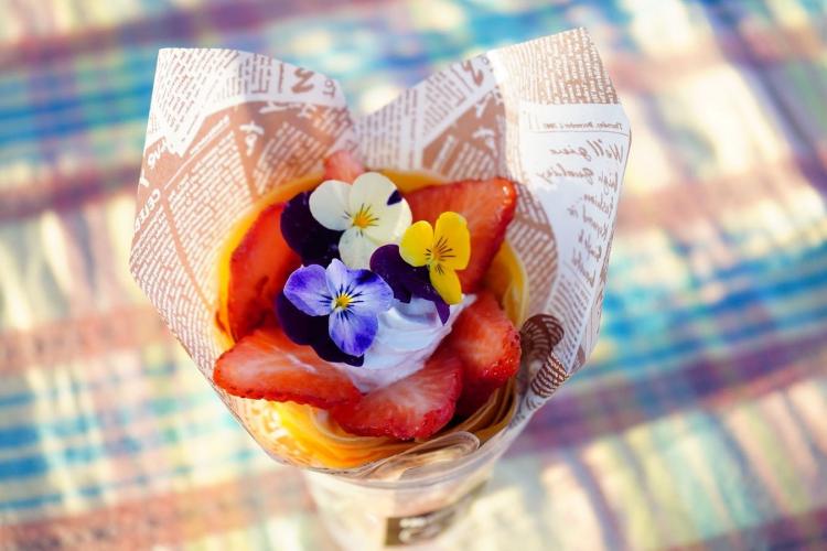 夏の終わりに登場する、“エディブルフラワー”をあしらった「ブーケクレープ」(650円)が10月1日から販売開始!