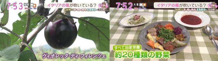 城戸さんが育てているナス「ヴィオレッタ・ディ・フィレンツェ」(左)と「朝食イタリアン キッキリッキー」の料理(右)