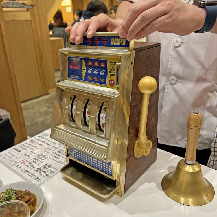 店のどこかから出てきたスロットを回して当たりが出たら無料でプレゼントとのこと。
