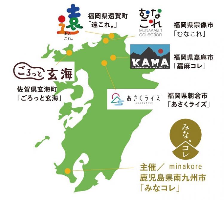 「コレコレ群団」とは、鹿児島県南九州市「みなコレ」、福岡県宗像市「むなこれ」、福岡県嘉麻市「嘉麻コレ」、福岡県遠賀町「遠これ。」、福岡県朝倉市「あさくライズ」、佐賀県玄海町「ごろっと玄海」の6団体のこと。各地域の自慢の品を通じて地元をPRする事業グループです。