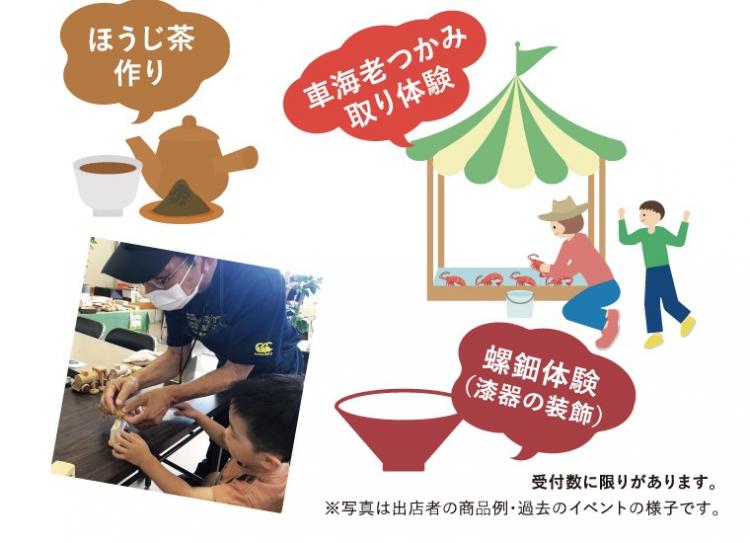 貝殻を用いて漆器の装飾をする「螺鈿細工体験」(両日)や「クルマエビのつかみ取り」(21日)、、焼いた餃子を持ち帰ることができる「餃子焼き方教室」、お茶農家による「ほうじ茶」作りの実演会&ふるまい(22日)と、ワクワクする体験企画が満載です!
