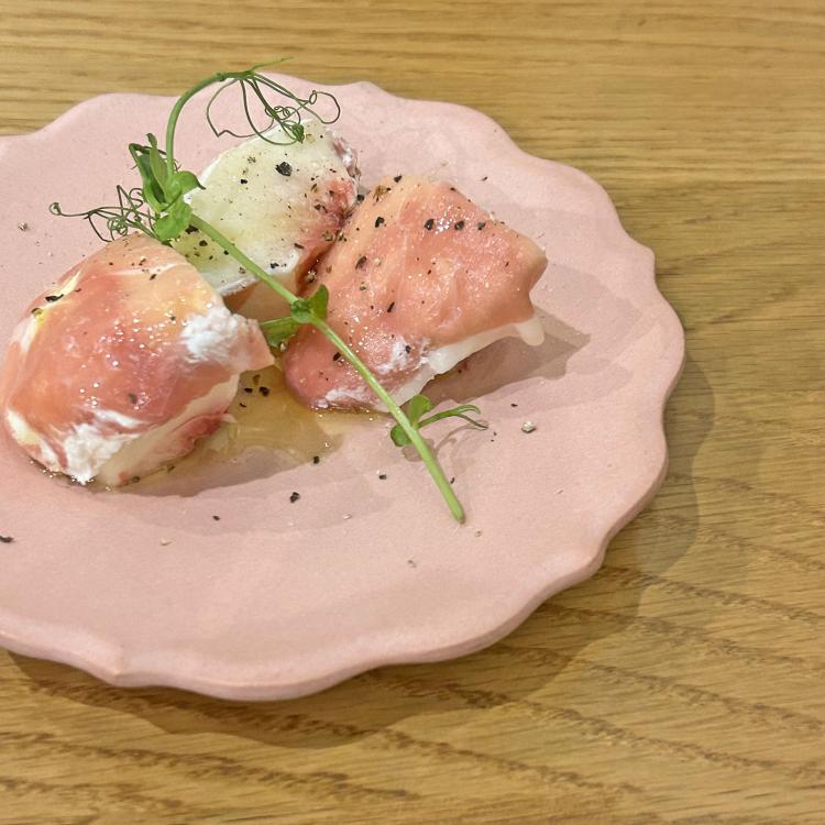 『桃と生ハムとクリームチーズ』。美味しくないわけがない。優しい味付けに心までホッコリ。
