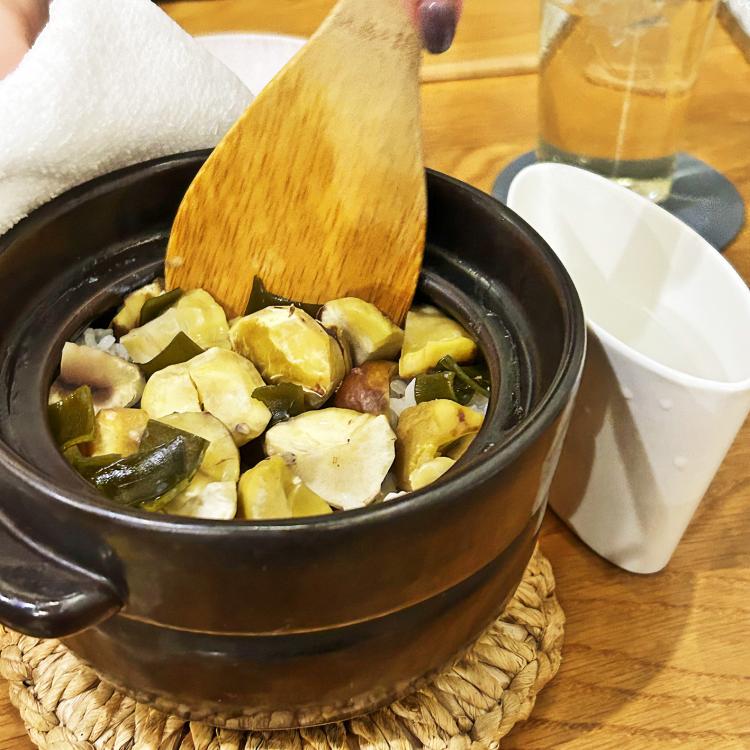 〆は名物のこちら。季節の素材を使った土鍋ご飯で、今回は栗ごはん!秋を心ゆくまで堪能。どんなにお腹いっぱいでも食べれちゃうくらいホクホクで優しい。提供に時間がかかるので、先に注文しておくのをおすすめします。ぜひ『もち乃き』で大切な人とゆっくりした時間を。
