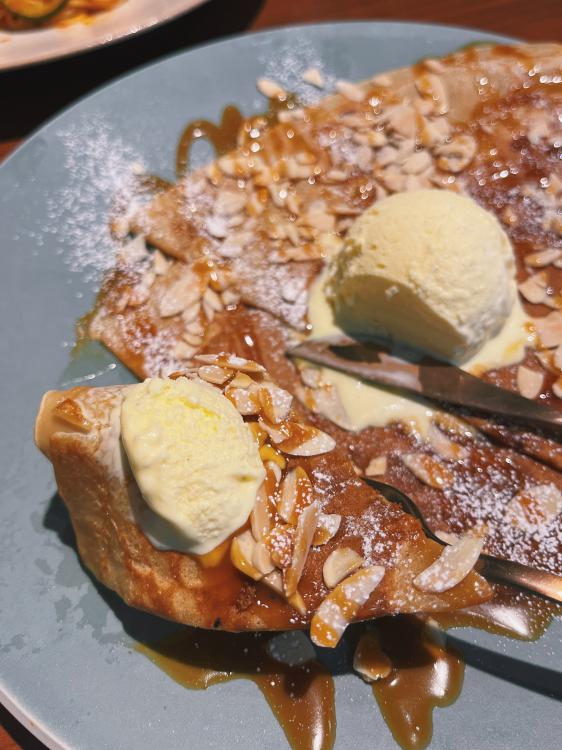 もっちりな生地に自家製のキャラメルソースと、バニラアイスをのせて。たっぷりのったアーモンドは食感が楽しくて、美味しくて、クレープ欲がどんどん満たされていく。。