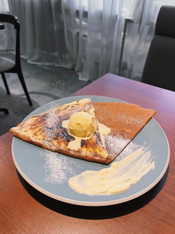 1番人気の『クリームブリュレ』。あったかい生地で溶けていくバニラアイスと、パリッとキャラメリゼされたお砂糖の香ばしさが最高。横に添えてあるホワイトチョコのクリームを少しつけても◎甘めのクレープよりも塩気がほしい人にはガレットメニューもありました。