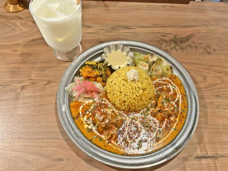 『天使のバタチキ』とはバター・生クリームを使わずにバターチキンカレーを表現したもの。ココナッツミルクやハチミツが入っていて、濃厚なのに罪悪感なくいただけます。お米も、ターメリッククミン玄米ともち麦なので、毎日食べても重くならない、このお店ならではのバターチキンカレーなのです。