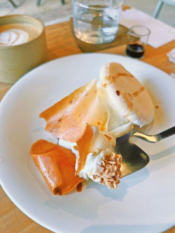 美味しさに大感動した『白いティラミス』。少しの力でさくっと割れるくらい繊細なメレンゲ。ほんのり塩気を感じるチュイール。優しく苦いコーヒーソース。アイスと自家製のクランチが下にあって、食べ進めるのが楽しい。思わずにっこりです◎