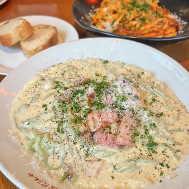生パスタの麺は「プレーン」か「ほうれん草麺」か選択可能!クリームパスタ✖️ほうれん草麺の相性も良い。クセがなく味の邪魔もしない、具材がゴロゴロ入って食べ応え最高!なんと大盛りも無料なので、お得に心いっぱい堪能できる◎
