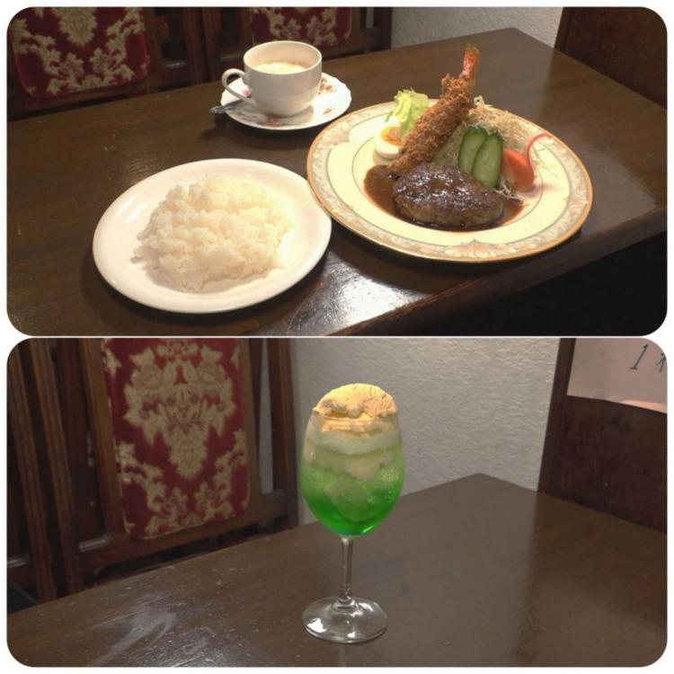 大人気の洋食セット「エビ&ハンバーグのセット」(1200円)と、「クリームソーダ」(700円)をいただきます!