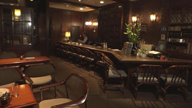 あえて照明を落とし、“書斎をイメージした”という空間には、長めのカウンターとシックなテーブル席がいくつか。テーブルの上にシュガーポットと灰皿が置かれているところにも、昭和を感じます。インテリアやイスなど、ほぼ創業当時のままだそう。