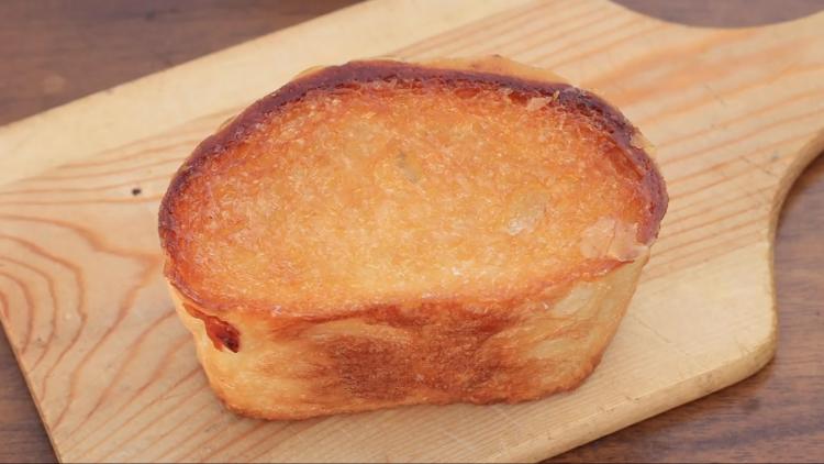 『ソフトフランス』(300円)をカットして、ハチミツ&「よつ葉バター」を塗ってこんがり焼いています。周りのカリッとしたところがおいしい♪