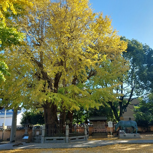 二日市八幡宮の境内に鎮座するご神木の公孫樹(いちょう)や、九州最古の寺院とも伝わる武蔵寺(ぶぞうじ)のモミジを散策しながら、アートや音楽、そしておいしいものを楽しめるイベントです!(写真のイチョウは11月15日時点)