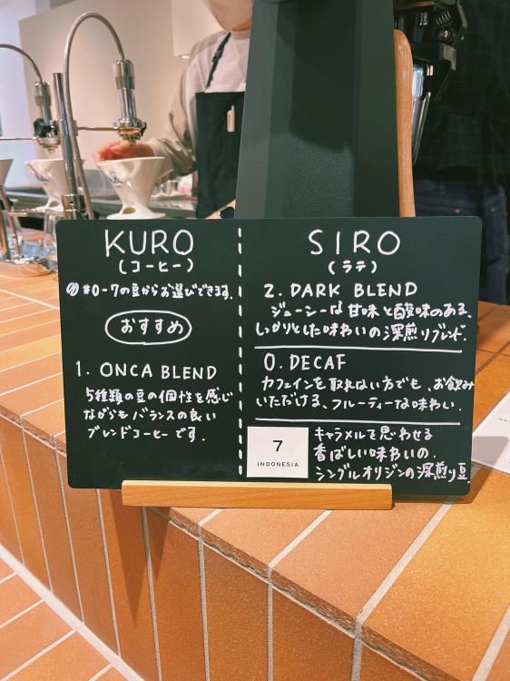 メニューはシンプルで『KURO』と『SIRO』の2つ。『KURO』がコーヒー、『SIRO』がラテ。カフェラテが好きな私は『SIRO』にしました。