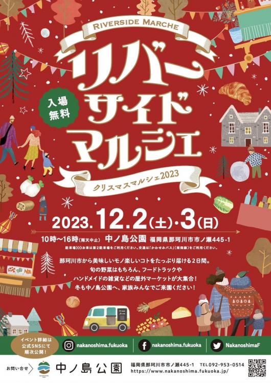 那珂川を中心とした人気店30店舗以上のキッチンカーや出店が並ぶ『リバーサイドマルシェ クリスマスマルシェ2023』が開催されます。