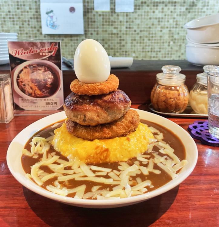 そして、実はここ、知る人ぞ知る『タワーカレー』というメニューもあるんです。週末にはこれ目当ての人も多くいるんだとか。上から、ゆでたまご、イカリング、ハンバーグ、コロッケ、オムチーズが乗った特大カレー!!いちばん上のゆでたまごは、自分で乗せるスタイルなので、落ちないかハラハラしながら最後の