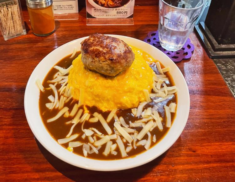 私は隣の常連さんがお勧めしてくれた『おむチーズカレー』に『ハンバーグ』をトッピング。このハンバーグが、ふわっふわで肉汁たっぷりで美味しすぎ。卵に包まれたご飯もボリューミーで大満足の一皿でした。
