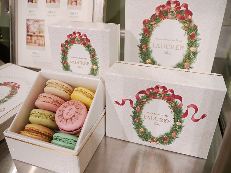ラデュレは1862年、パリで創業。今回は代名詞であるマカロンはもちろん、2023年9月に発売されたばかりの新作スイーツ「ウジェニー」、京都の金平糖専門店「緑寿庵清水」とのコラボ商品などを携え、博多に舞い戻ってきました。